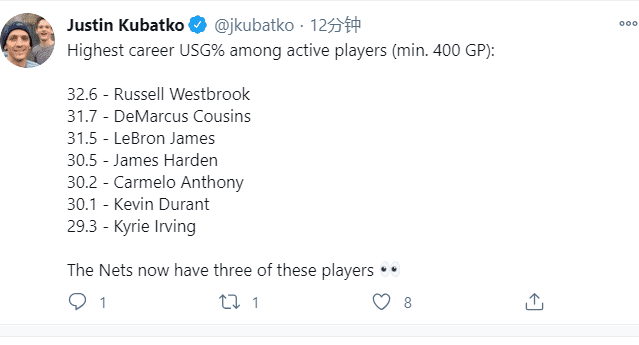 Justin Kubatko分享了一组NBA现役最高使用率球员的排名!其中韦少32.6%排名第一,考辛斯第二,詹姆斯第三,哈登第四,安东尼第五,杜兰特第六,欧文第七。也就是说,现役前7中的3人都在篮网。Justin Kubatko用一个大眼睛来表达对于这组数据的所带来后果的观望。