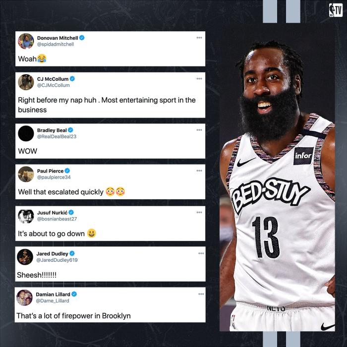 火箭把哈登交易到篮网引热议,比尔、米切尔直呼哇哦太不可思议,保罗-皮尔斯:这交易发生的太快了;开拓者双枪第一时间发推,CJ-麦科勒姆:刚想小憩一会交易就来了,NBA真是最有娱乐性的商业联盟;利拉德盛赞篮网队火力太强了。