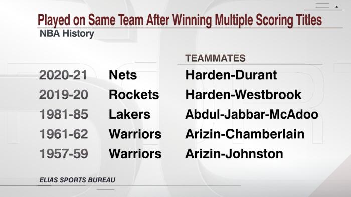 哈登和杜兰特成为NBA历史第五对都是得分王并且效力同一队的组合,他俩也是NBA史上首对都至少拿到3次得分王并效力一队的组合;过去11个赛季,哈登和杜兰特总共夺得7次得分王,这得分天赋真是没谁了。