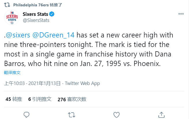 在上半场的比赛中,格林就命中了4记三分,首节和次节各命中2个!下半场,皇阿玛三分疯狂出手,其中第三节7投3中,第四节8中2!常规时间结束,格林已经疯狂命中9个三分,直接创造了个人生涯新高!据76人官方统计,9记三分也追平了76人队史纪录!