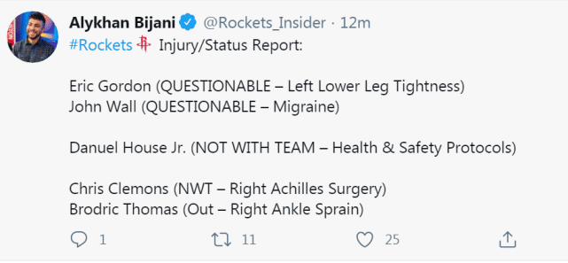 24直播网讯 北京时间1月12日,火箭队进行训练,备战和湖人的第二场比赛。对于火箭来说,他们的首发可能会有所变化。据主帅赛拉斯在采访中透露,沃尔由于偏头痛缺席了今天的训练,明天的比赛是出战成疑(questionable,50%上场概率)的状态,而此前由于背部痉挛连续缺席4场比赛的豪斯,出现了新状况,他将因健康安全协议接受隔离,预计缺席更多的比赛。