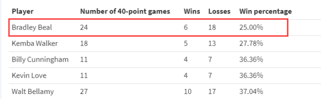 24直播网1月11日讯 轰下40+的分数,球队却赢不了球,这显然是一件令人扎心的事。本赛季至今,奇才球星比尔两次得分突破40分,球队却都输了比赛,把上赛季也算上的话,近两年,比尔有12场比赛得分40+,奇才竟然输了其中11场。近日,美媒HoopsHype公布了一份历史球星40+得分的胜率排行榜,比尔排名倒数第一。