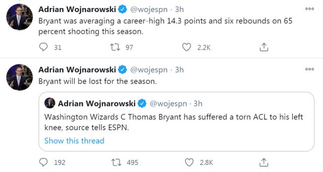 24直播网讯 北京时间1月11日,据ESPN报道,多位消息人士透露,奇才中锋托马斯-布莱恩特遭遇左膝前十字韧带撕裂,赛季报销。
