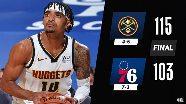 24直播网讯:北京时间1月10日消息,NBA常规赛继续进行。做客的掘金队经过四节较量以115-103轻取76人队,76人队遭遇2连败。