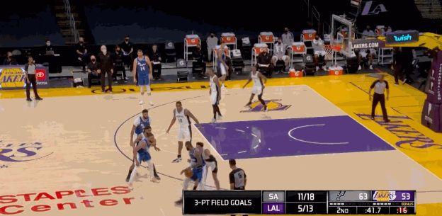 詹姆斯不顾塔克的招手示意选择从右侧碾压着马刺的约翰逊向内线杀去,在成功吸引了包夹之后,詹姆斯把球传给了空位的库兹马,库兹马稳稳命中三分。