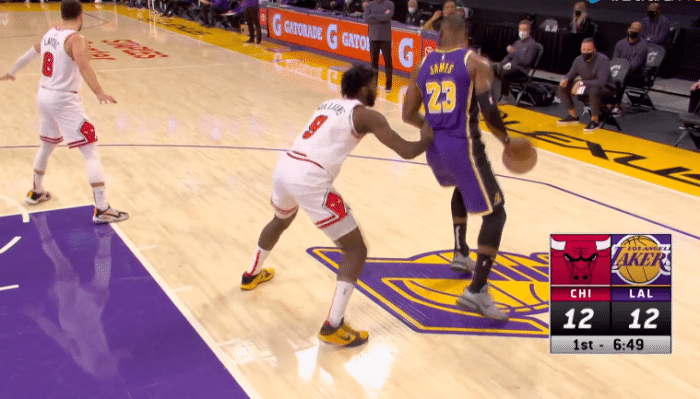 末节湖人一度领先到12分,詹姆斯摔倒躺射2+1太疯狂,此时老詹躺在地板上秀肌肉庆祝;随后拉文带队追分,关键时刻大莫里斯和施罗德都命中三分球,紧接着公牛连续得分,终场前1分19秒,湖人仅仅领先2分。