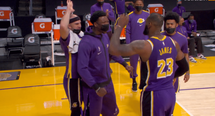 生死时刻,詹姆斯一招碾压式突破杀到禁区把球打进还造犯规,可惜罚球不中,随后坦普尔三分续命,詹姆斯超远三分打铁不中,拉文投篮也不中,最终湖人赢球,浓眉因伤休战,36岁詹姆斯带领湖人笑到最后。