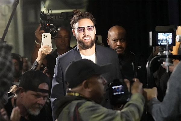克莱迎来回家之战,身穿西装走进大通中心球馆时,勇士队将近400名员工夹道欢迎并且脱帽致敬;赛前勇士为克莱播放致敬视频,全场球迷为他欢呼以及脱帽致敬,克莱获得最大的尊重。