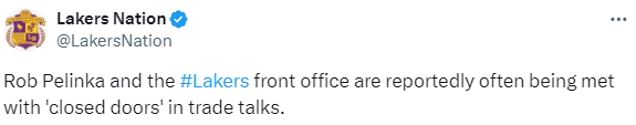 24直播网讯北京时间11月15日,目前湖人7胜4负排在西部第6位,但由于球队内线又遭打击,湖人管理层开始行动了,据报道,湖人想要补强前场,但湖人在交易谈判时频繁吃到闭门羹。