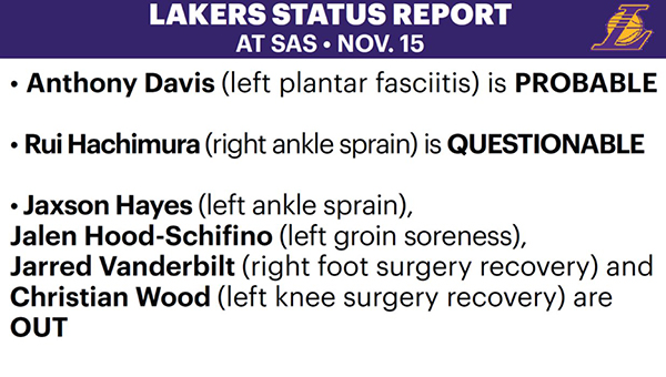 湖人也公布了下一场对阵马刺的伤病报告——安东尼-戴维斯(左脚足底筋膜炎)大概率出战;八村垒(右脚踝扭伤)出战成疑;贾克森-海斯(左脚踝扭伤)、杰伦-胡德-希菲诺(左侧腹股沟酸痛)、贾里德-范德比尔特(右脚手术恢复)、克里斯蒂安-伍德(左膝手术恢复)都缺席比赛。