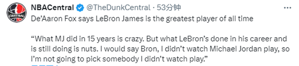 关于谁是NBA历史第一人的话题一直备受争议,近日在节目中谈到谁是自己的GOAT,福克斯公开表示:乔丹在15年生涯里所取得的成就太疯狂了,但詹姆斯生涯至今所做的事情令人难以置信,我选择勒布朗。我没看过乔丹打球,所以不会选他。