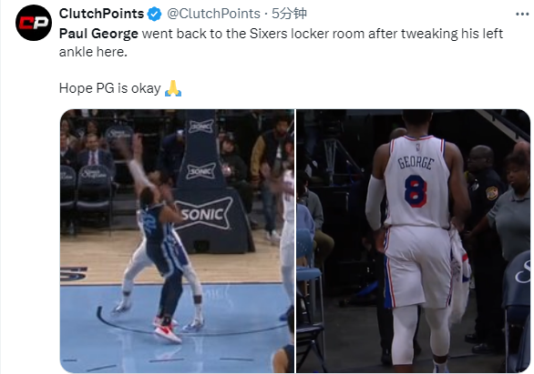 下半场76人遭遇意外伤病,第三节11分21秒,乔治抢篮板时不幸受伤,左腿受伤,他传球后蹲在后场走不动了,之后乔治离场返回更衣室接受检查;随后76人官方宣布,乔治左膝过度伸展,本场比赛不会回归。