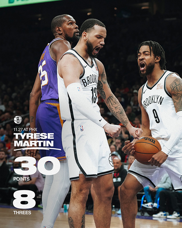 昨天篮网客场127-117击败拥有杜兰特、布克和比尔三巨头的太阳,篮网双向合同球员泰雷斯-马丁打出生涯代表作,替补登场27分钟,13投10中、三分10中8轰下全队最高的30分,还有贡献4个篮板和2次助攻,成为篮网射落太阳的大功臣之一。