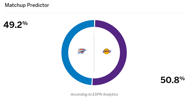 目前湖人11胜7负排在西部第5位,雷霆14胜4负排在西部第一,两队相差3个胜场;ESPN官方预测本场比赛的胜率,湖人赢球概率50.8%,雷霆49.2%。