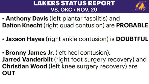 安东尼-戴维斯(左足底筋膜炎)与克内克特(右四头肌挫伤)大概率出战(75%出战概率);海斯(右脚踝挫伤)本场比赛小概率出战(25%出战概率);布朗尼(左脚跟挫伤)、范德比尔特(右脚手术恢复)、伍德(左膝手术恢复)将继续缺席本场比赛。