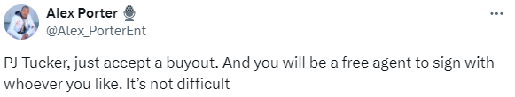 快船球迷表示:PJ-塔克,接受买断吧。然后你就会成为自由球员,可以和任何你喜欢的球队签约吗,这并不难!
