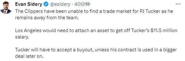 据《福布斯》NBA记者Evan Sidery报道,快船一直未能在交易市场上交易掉PJ-塔克,而塔克本人也一直处于离队状态,快船可能得添加一些额外的交易资产才能摆脱塔克1150万美元的合同;除非塔克的合同被用于更大的交易(薪资配平),否则,塔克将不得不接受买断。