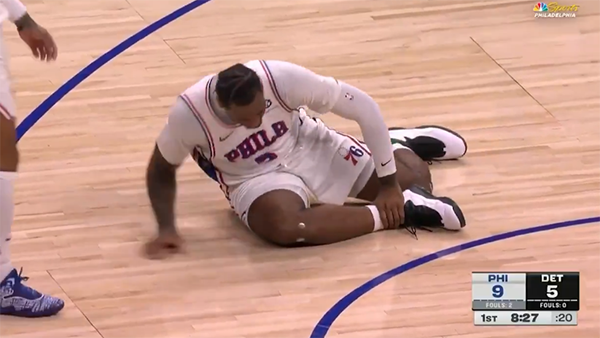 24直播网讯北京时间12月1日,NBA常规赛76人客场对阵活塞,恩比德因伤病管理继续休战,乔治复出重返赛场,但费城又遭伤病打击,“庄神”德拉蒙德90度崴脚痛苦倒地,被搀扶离场并且因伤早早退出比赛。