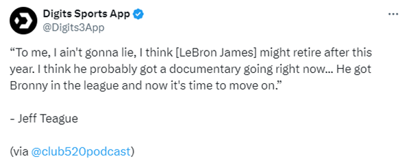 詹姆斯的糟糕表现引热议,名嘴帕金斯暗示强如詹姆斯也到了退役的年龄;今日前NBA球员杰夫-蒂格在节目中表示:对我来说,我不会说谎。我认为勒布朗-詹姆斯可能会在本赛季结束之后退役。我觉得他现在可能正在拍一部纪录片。他已经让布朗尼进入了联盟,现在是时候继续前进了。