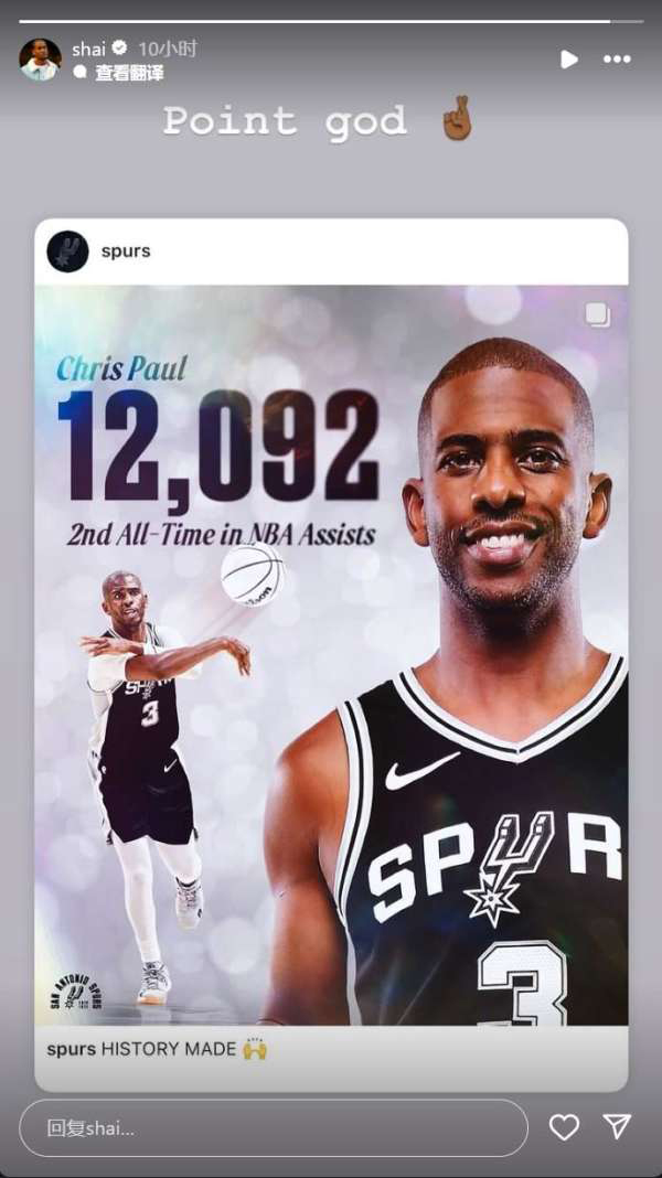 勇士球星库里在Ins上送上祝贺,他写道:控卫之神!恭喜兄弟;太阳球星布克和雷霆球星亚历山大也转发保罗创纪录的海报,配文写道:控卫之神。