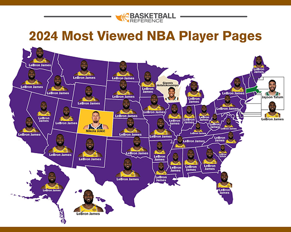 美媒晒出2024年美国各州被浏览次数最多的NBA球员,全美50个州,湖人球星詹姆斯一个人霸占47州,约基奇、字母哥和塔图姆各占一个州,在这张图片中,一眼望去全是身穿湖人紫金战袍的詹姆斯,球迷调侃约基奇被詹姆斯包围了。