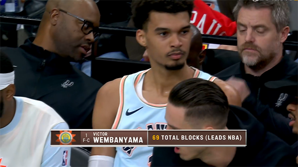 上半场,文班亚马出战17分钟,11投5中拿到14分6篮板4助攻5盖帽,在得分、助攻和防守方面都展现不俗的天赋。