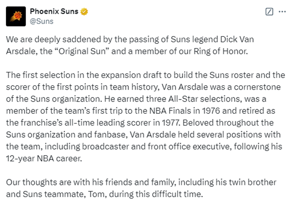 太阳官方声明:我们对太阳队史传奇人物迪克-范-阿斯代尔的去世深感悲痛,他最初的太阳人,也是我队史荣誉戒指的一员。
