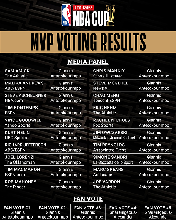NBA杯MVP投票结果明细:字母哥在媒体投票中获得全部20张选票,在球迷投票中获得3票(一共5票,亚历山大获得2票)。