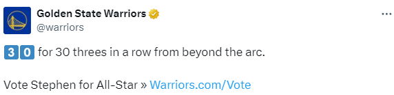 勇士官方晒库里训练视频,写道:30号连中30记三分球,全明星为库里投票;从视频中可以看出,库里仅仅只用1分49秒就连续命中30记底角三分,第31投打铁后,库里又连中3记三分,第35投打铁,第36投再次命中;很明显,库里想要通过苦练的方式找回准星。