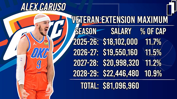 卡鲁索的合同细节,据薪资专家Yossi Gozlan报道,卡鲁索签下4年顶薪合同,2025-26赛季年薪1810万美元,26-27赛季1955万美元,27-28赛季2099万美元,28-29赛季2245万美元。
