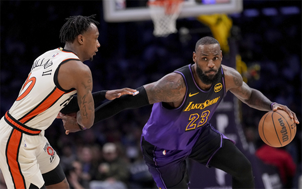 湖人本赛季第二次对阵活塞,詹姆斯第一节登场8分钟,背打坎宁安杀到禁区暴扣,外线命中三分以及多次送出精彩助攻,首节4中3拿到7分4助攻3篮板,可这一节最后2分钟湖人被活塞打出10-0的反击高潮,詹姆斯防到位仍被对手命中不讲理压哨三分。