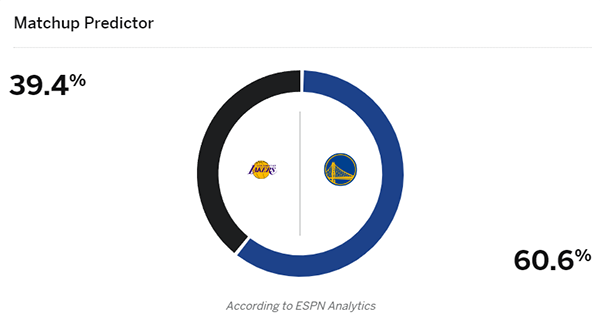 NBA官方晒詹姆斯和库里对阵的海报,为湖勇大战预热;ESPN预测湖人赢球概率为39.4%,勇士赢球概率为60.6%;换言之,美媒更看好勇士主场击败湖人。