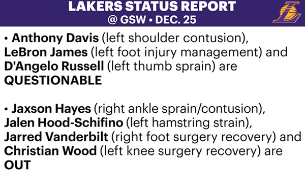 浓眉(左肩挫伤)、詹姆斯(左脚伤病管理)和拉塞尔(左拇指扭伤)出战成疑,50%出战可能性;希菲诺(左腿筋拉伤)、海斯(右脚踝扭伤/挫伤)、范德比尔特(右脚手术恢复)和伍德(左膝手术恢复)都因伤继续缺战。