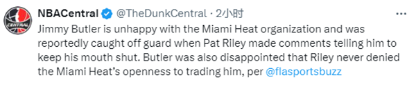 据flasportsbuzz媒体报道,巴特勒最近对热火很不满意。他对球队总裁莱利的一些言论感到意外,比如莱利在五月的一次发布会上让他说话“闭嘴”。