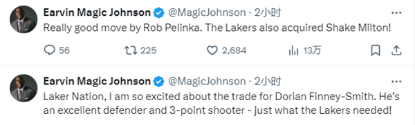 对于湖人的操作,湖人名宿魔术师发推写道:湖人国度,我对芬尼-史密斯的到来感到非常兴奋,他是一名出色的防守球员和三分射手——这正是湖人队所需要的!佩林卡的这笔交易真是太棒了,湖人还得到了米尔顿!