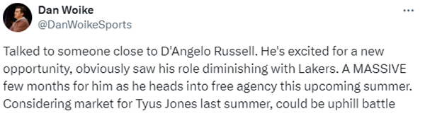 据湖人随队记者Dan Woike报道,一位不愿透露姓名的拉塞尔身边人士透露,拉塞尔对重返布鲁克林、并有机会在下个休赛期进入自由市场确立自己的价值感到兴奋,显然他在湖人队的角色正在逐渐减少。