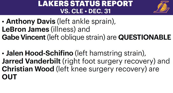 詹姆斯(生病)、浓眉(左脚踝扭伤)、文森特(左侧斜方肌拉伤)出战成疑,50%出战可能性;希菲诺(左腿筋拉伤)、范德比尔特(右脚手术恢复)和伍德(左膝手术恢复)继续缺席比赛。