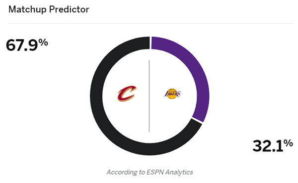 目前湖人18胜13负排在西部第五,骑士27胜4负排在联盟第一,湖人挑战联盟第一,对于本场比赛,ESPN预测:湖人赢球概率为32.1%,骑士赢球概率67.9%,换言之,美媒更看好骑士客场取胜。