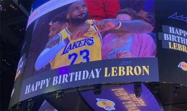 第二节湖人和骑士打得十分胶着,半场打完湖人53-58落后5分,这一节詹姆斯4投1中只拿到2分2篮板,得分来自空切双手暴扣,浓眉和里夫斯等人输送火力;上半场詹姆斯10投5中拿到12分2篮板1盖帽2失误;值得一提的是,期间湖人官方在主场祝詹姆斯40岁生日快乐,老詹比心+LA手势示爱球迷。