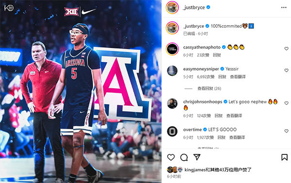 布莱斯亲自掷地有声地宣布:“我100%承诺加盟亚利桑那大学”,言辞间满是坚定与憧憬。此消息一经传出,如同涟漪般迅速扩散,引得众多球星纷纷送上祝福。浓眉、保罗毫不吝啬地点赞,杜兰特则在评论区热情鼓掌,这些叔叔辈的球星们用行动表达着对布莱斯的认可与喜悦,足见布莱斯在篮球圈的人缘与潜力备受看好。