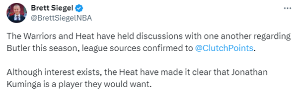 巴特勒和勇士之间都互相有意,但热火方面明确表示,若想要巴特勒,一定要把库明加放入交易框架之中。虽然联盟内部对库明加的长期未来分歧较多,但勇士到目前为止并不急于将库明加放入交易谈判之中。