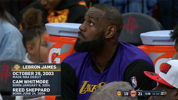 下半场,湖人第三节疯狂反扑,詹姆斯轰进三分以及快攻反击得分,外线再中三分,连续助攻浓眉打停火箭,湖人一波21-8追到5分;火箭得分止血,詹姆斯又连中2记三分,更是轰进不讲理的金鸡独立式三分,湖人单节40-24追回16分,三节打完湖人暂时落后2分,这一节詹姆斯6投5中独砍14分3助攻2篮板,40岁仍开启全力詹模式。