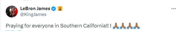 当地时间凌晨,詹姆斯发推写道:为南加州的每个人祈祷。