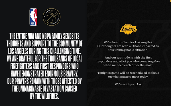湖人官方声明:我们为洛杉矶感到心碎,我们与所有受到这一难以想象的灾难影响的人同在,我们感谢第一批救援人员和所有在我们最需要彼此时团结在一起的人,今天的比赛将重新安排,以关注对我们来说最重要的事情,我们与你同在,洛杉矶。