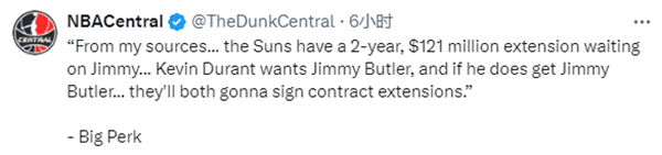 名嘴帕金斯在节目中爆料:从我的消息来源来看,太阳愿意给巴特勒一份2年1.21亿美元的续约合同,杜兰特想要巴特勒,如果巴特勒真来了,他们俩都会和太阳签下续约合同。