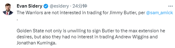 据此前报道,巴特勒已经告知灰熊、掘金、雄鹿等队自己没兴趣为他们效力;如今名记Sam Amick报道,勇士对交易得到巴特勒不感兴趣,勇士不仅不愿意与巴特勒签下他所希望得到顶薪续约合同,而且他们也没有兴趣交易维金斯和库明加。