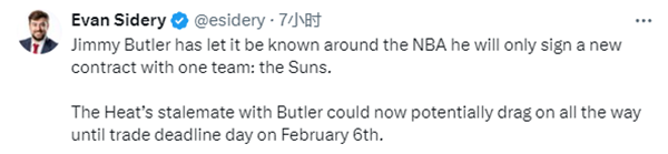 据美记者Evan Sidery报道,吉米-巴特勒已经告知联盟各球队,他只会和太阳一支球队续签新合同,热火和巴特勒的僵局可能要持续到2月7日的交易截止日。
