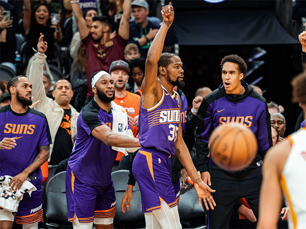 末节太阳又领先到两位数,面对老鹰的反扑,杜兰特轰进三分,琼斯也轰进三分,4分03秒太阳117-105领先12分;暂停回来,杜兰特助攻阿伦命中三分,太阳哑火,老鹰一波10-0打回悬念,杜兰特关键传球,35.6秒阿伦制胜一击,比尔抢断杀死比赛,布克罚球锁定胜局,最终太阳主场拿下胜利。