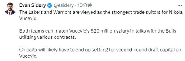 24直播网讯北京时间1月13日,据美记者Evan Sidery报道,目前湖人和勇士被视为是中锋武切维奇的最强追求者,两队都能用资产配平武切维奇2000万美元的合同,公牛最终可能只能用武切维奇换来二轮签的筹码。