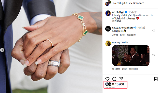 阿里纳斯晒出自己拥抱亲吻爱妻以及抱着爱妻的幸福合影;43岁阿里纳斯宣布完婚引热议,36岁的杜兰特(至今单身)、詹姆斯的二儿子布莱斯、霍华德、JR-史密斯等人点赞祝贺。